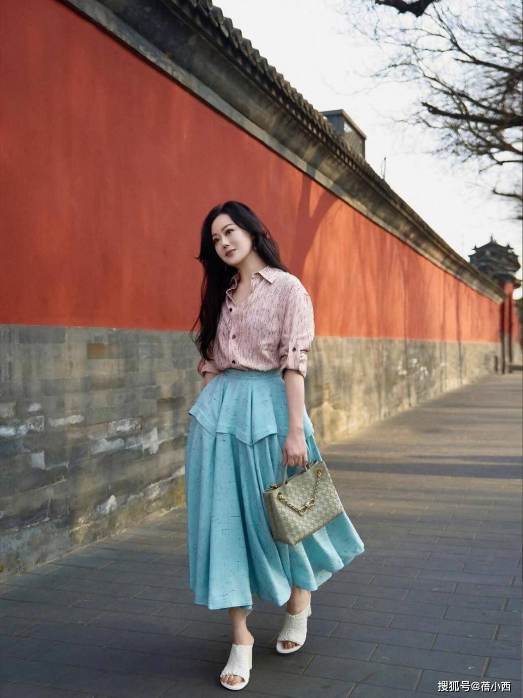 而搭配她的蓝色半身裙则更是描绘出一个独特的画面,既复古又透着性感。那优雅的剪裁,使得她的身形比例更加完美,轻松展现出优雅的S曲线。裙长至脚踝,对于梨型身材的女性尤其友好,展现了一种清新脱俗的美感,令旁人眼前一亮。裙摆的印花设计,仿佛一幅流动的画卷,淡蓝色的底色更是映衬出女性的气质,那神秘的韵味令人陶醉。