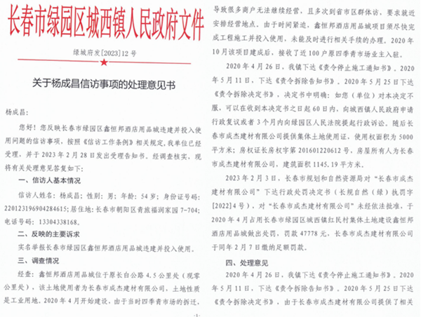 杨成昌的实名举报得到了政府文件的印证。城西镇政府文件(绿城府发[2023]12号)《关于杨成昌信访事项的处理意见书》称:“经查:鑫恒邦酒店用品城位于原长白公路4.5公里处(现零公里处),该土地使用者为长春市成杰建材有限公司,土地性质是工业用地。2020年4月开始建设,由于当时四季青市场的拆迁,导致很多商户无法继续经营、且多次到省市区群体访,要求就近安排经营地点。由于时间紧迫,鑫恒邦酒店用品城项目须尽快完成工程施工并投入使用,未能及时进行相关手续的办理。2020年10月该项目建成后,接收了近100户原四季青市场业主入驻。2020年4月26日,我镇下达《责令停止施工通知书》。2020年5月11日,下达《责令拆除告知书》,2020年5月25日下达《责令拆除决定书》,决定书中明确:如您(单位)对本决定不服,可以在收到本决定书之日起60日内,向城西镇人民政府申请行政复议或者3个月内向绿园区人民法院提起行政诉讼。随后长春市成杰建材有限公司提供集体土地使用证,使用权面积为5000平方米;房权证长房权字第201601220612号,房屋所有人为长春市成杰建材有限公司,建筑面积1145.19平方米。2023年2月3日,长春市规划和自然资源局对“长春市成杰建材有限公司”下达行政处罚决定书(长规自然(绿)执罚字[2022]4号),对“长春市成杰建材有限公司”未经依法批准,于2020年4月占用长春市绿园区城西镇红民村集体土地建设鑫恒邦酒店用品城做出处罚,罚款47778元,长春市成杰建材有限公司于同年2月7日缴纳足额罚款。”
