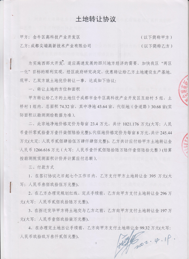2001年,成都市金牛区人民政府邀请成都尖端公司,采用招商引资的方式,于2002年,2004年,成都金牛区高管委与成都尖端公司签订《土地转让协议》、《土地转让补充协议》共六份合同,合同总用地约125亩。
