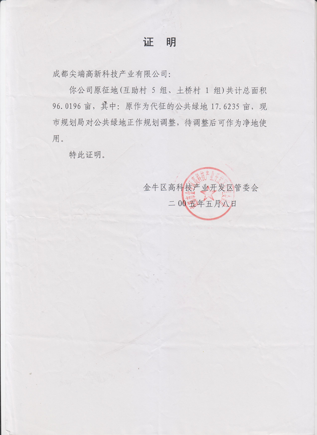 2005年5月8日,成都尖端高新技术产业有限公司已向金牛区高新技术产业开发区管委会付清了96.0196亩土地的全部费用,办国有土地证书时含带征地81亩多,第一次,14亩多土地被金牛区高新技术产业开发区管委会侵占了。