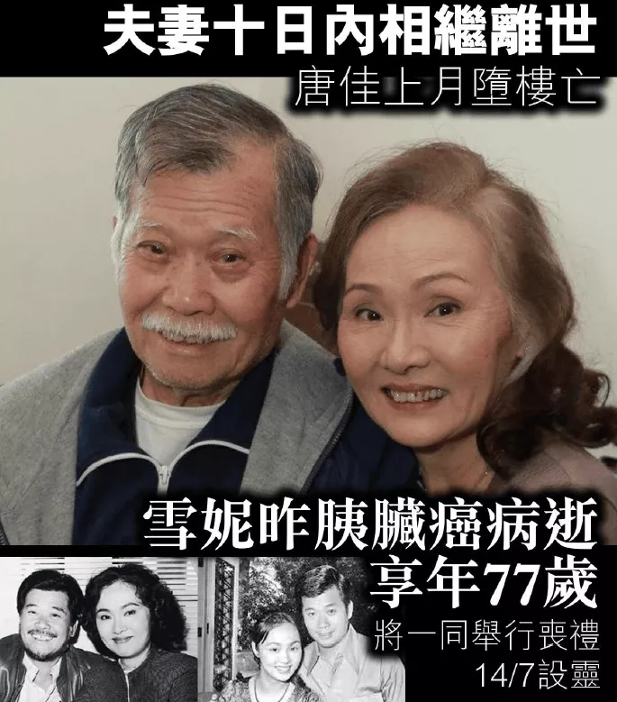 6月份,演员兼武术指导唐佳坠楼身亡,享年88岁。他生前曾向儿子透露,因妻子长期住院治疗而感到难过,更表示希望与太太同死。10天后,妻子雪妮因为胰脏癌医治无效在院病逝,享年77岁。两人因为拍摄电影《女黑侠木兰花》结缘。