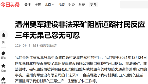 我们是浙江省永嘉县乌牛街道仁源村龙潭自然村的村民。我们曾于2021年12月24日向永嘉县政府投诉举报了温州奥军建设有限公司擅自在我村开山挖石、非法采矿、非法毁林、破坏原始植被并明目张胆地擅自毁坏我村原有的林地防火通道等涉嫌犯罪的事实。温州奥军建设有限公司的非法采矿,直接导致了我村村民们出入道路的阻断,严重阻碍了我们村民的正常生产、生活和护林工作等。