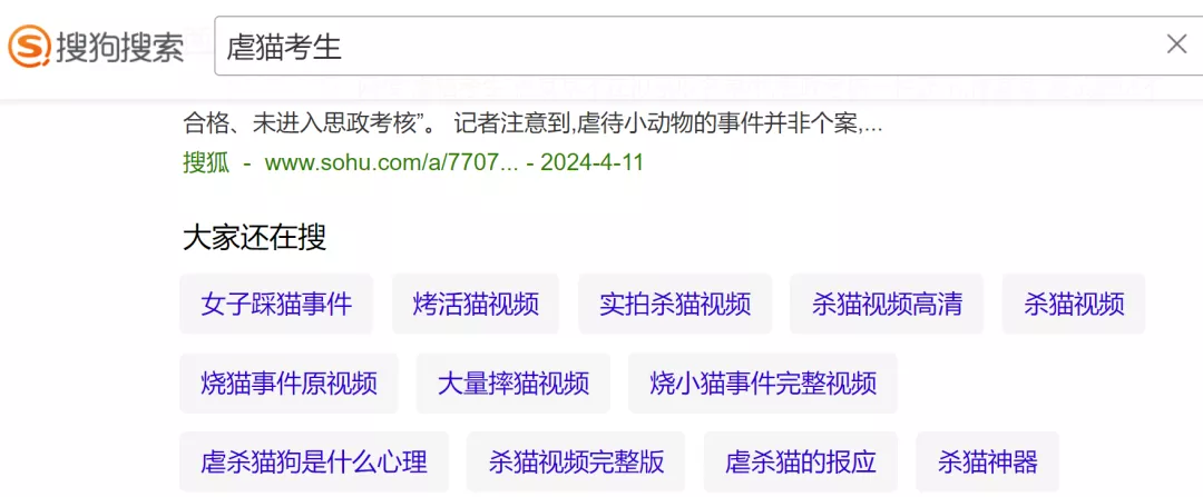 确实,这几年虐猫等虐待动物事件频发,一次次牵动我们的神经。比如,前两年曾引发广泛关注的“虐猫考生”徐某因虐待动物被南京大学拒录。而当我们搜索这类事件时,会关联发现各类“杀猫”、“虐猫” 等大量相关的暴力信息,也证明这一问题的网络蔓延。