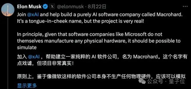 与此同时,他还在推进“巨硬(Macrohard)计划”——用AI自动化软件开发。他表示: