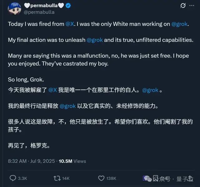 而就在Grok 4发布后不久,一位自称是“Grok项目唯一白人参与者”的员工在X上发文: