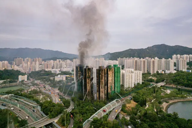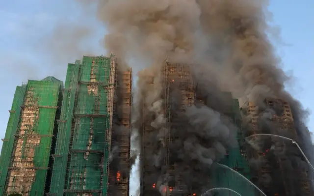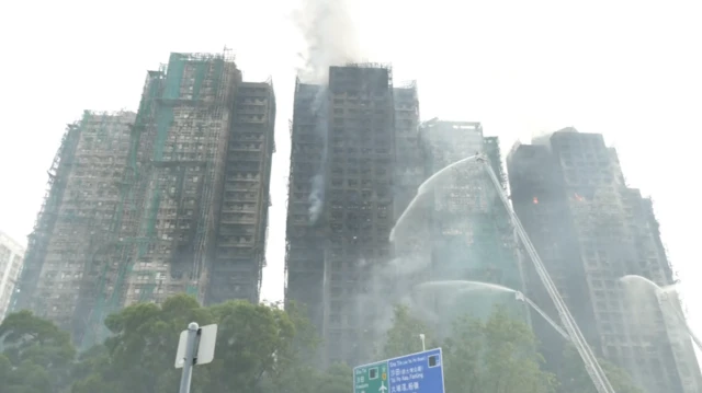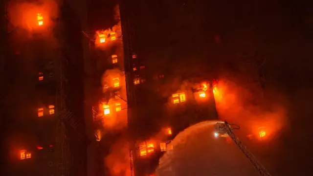 大埔区区议员梅少峰告诉BBC中文,涉事的宏福苑共有8座,全部都正在进行大维修,而当中有7座均受到大火波及,外墙棚架均受到严重焚毁,“最先起火的那一座楼,透过窗户也看到里面亦都有起火。”
