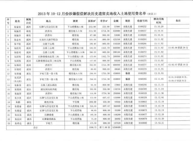 同时,村民还举报反映溪美朱村支部副书记兼任林兜经联社负责人朱镇武,在任职期间曾大肆侵占集体土地,通过以租代售的方式,牟取私利。其中有村民朱乔成,于2001年元月起承租村高新路西大堤旁边角地,每年缴纳租金5000元,后朱镇武私自将土地出售给朱乔成建设了9层楼房,占地约5亩左右。于2017年建成。