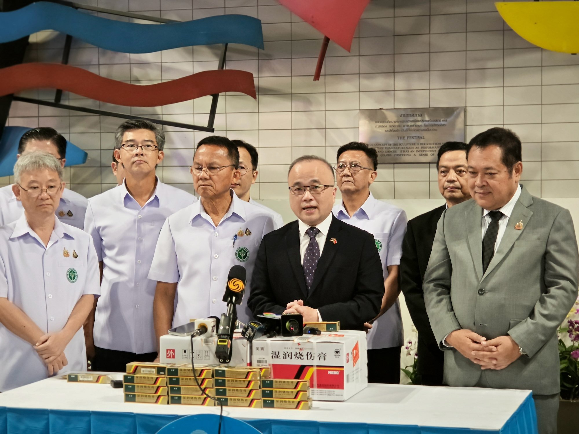 受韩志强大使委托,吴志武公使10月2日在廊曼国际机场向泰方转交烧伤药膏,泰国卫生部长颂萨、司法部长他威出席交接仪式,并向中方表示诚挚谢意,相关药品将尽快送至医院治疗伤者。