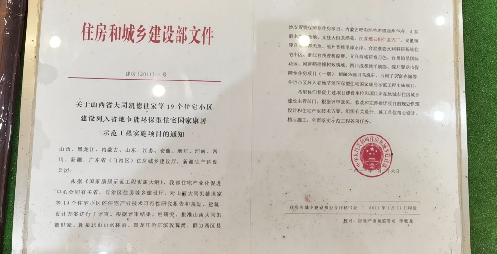2011年,“省地节能环保型住宅国家康居示范工程实施项目”审批文件,其中恒仁·嘉天下入选该项目。