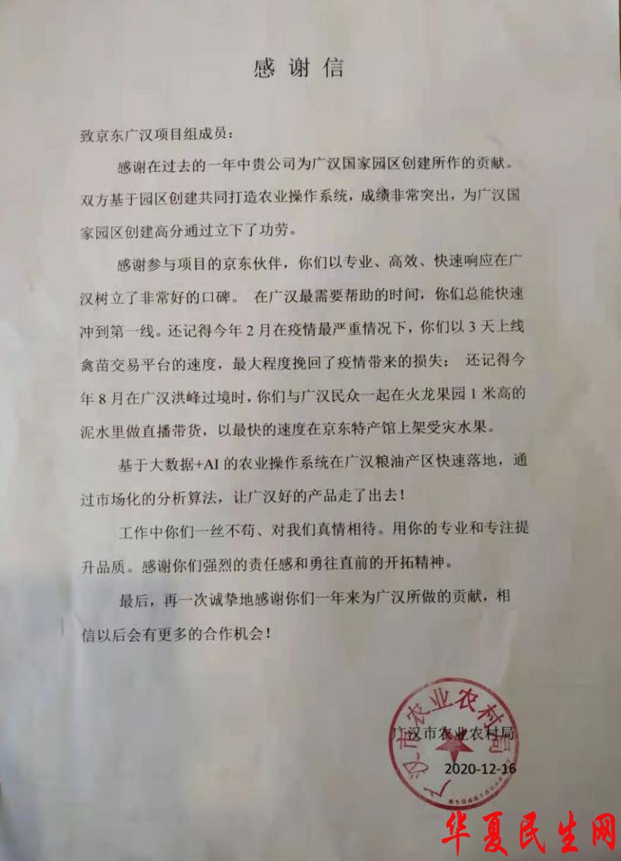 12月16日,京东数科收到了一封来自广汉市农业农村局的感谢信。