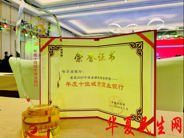 哈尔滨银行四度荣获“年度十佳城市商业银行”大奖,图为奖杯及证书。