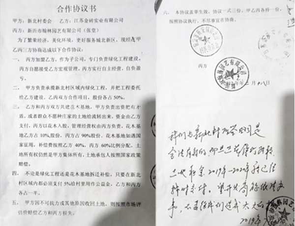协议还约定,不论绿化工程还是花木基地拆迁补偿,只要在新北村区域内都必须支付5%给村里用作公益金,乙方合和丙方各占一半;甲方因不可抗力或其他原因收回土地,则按照市场评估赔偿乙方和丙方损失。