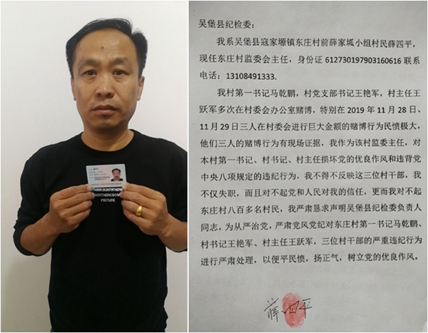 薛四平在举报信中还说:因举报人于2019年1月20日曾向吴堡县纪委、吴堡县公安局实名举报三被举报人,并向纪委、公安局提供三被举人在东庄村委会赌博的视频资料,但时至今日,吴堡县纪委、吴堡县公安局没有给举报人作出任何答复,故无奈之下向市纪委实名举报,同时将举报信发布于网上,恳请市纪委实地调查该案,依法依规查处。与此同时,薛四平还配上了三名村官在一起玩牌的视频。