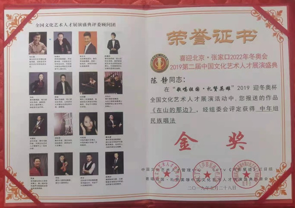 主要简历:1978年3月出生于河北省张家口涿鹿县太平堡村,从小对音乐酷爱和执着。1997年4月在涿鹿县卧佛寺乡太平堡小学担任幼儿音乐教师。2006年考入山东齐鲁音乐艺术学院,专修民族声乐和古筝,曾从师于中央音乐学院安英教授,并通过中央音乐学院的古筝专业师资考核认证。2011年在中国宁波红歌赛中,荣获第三名。由涿鹿县易枫老师和范春林老师谱写的原创歌曲,陈静演唱的《在山的那边》,获得了《喜迎北京,张家口2022年冬奥会》的金奖、2019年第二届文化艺术人才选拔赛中,获得金奖。2019年受涿鹿县委宣传部的邀请,担任庆祖国70周年华诞大合唱总决赛评委。中国河北鑫雅筝社创始人。