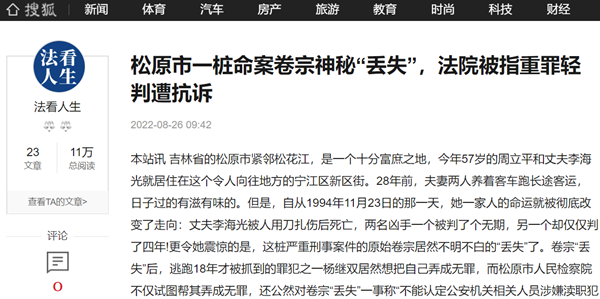 本站讯 吉林省的松原市紧邻松花江,是一个十分富庶之地,今年57岁的周立平和丈夫李海光就居住在这个令人向往地方的宁江区新区街。28年前,夫妻两人养着客车跑长途客运,日子过的有滋有味的。但是,自从1994年11月23日的那一天,她一家人的命运就被彻底改变了走向:丈夫李海光被人用刀扎伤后死亡,两名凶手一个被判了个无期,另一个却仅仅判了四年!更令她震惊的是,这桩严重刑事案件的原始卷宗居然不明不白的“丢失”了。卷宗“丢失”后,逃跑18年才被抓到的罪犯之一杨继双居然想把自己弄成无罪,而松原市人民检察院不仅试图帮其弄成无罪,还公然对卷宗“丢失”一事称“不能认定公安机关相关人员涉嫌渎职犯罪”!