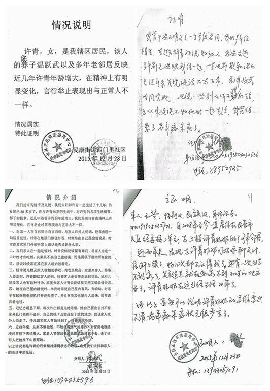 温跃武、周敬兰是经委楼住户,其父亲温明义1995年返聘结束后,体检发现患有老年痴呆小脑萎缩病症,认知、生活能力下降,身边又无子女,继母与父亲婚后感情不和,经常一人外出,把我父亲反锁房内不让外出,而且三顿饭也不应时,造成父亲胆摘除,两人外出时经常因话说不到一起,并用言语刺激我父亲造成人为走失,1996年——1999年3年间经常走失,每次少则一天,多则二、三天,由于经常走失使病情加重,大小便不知道,生活不能自理,经常走失,三更半夜找人,已影响其他家庭的正常生活,继母不尽责任,身边又无子女,父亲又有病,生活很困难。经父亲单位及家里人的意见,同意我们夫妇来照顾我父亲及继母生活。我夫妇是2000年来照顾老人的,与老人共同居住生活,2006年父亲病情发生其它变化后病故,继母许青仍然同意和我夫妇居住生活在一起,现在我夫妇和继母居住生活已达15年(2000年—2015年)。——引用自长春市南关区民康街道西门里社区居民委员会出具社区证明。
