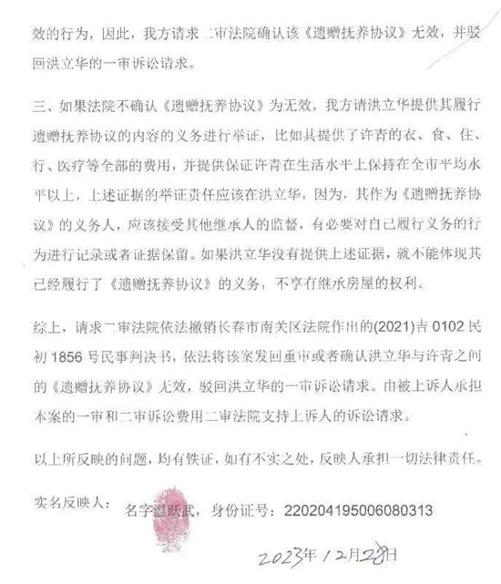 综上,请求二审法院依法撤销长春市南关区法院作出的(2021)吉0102民初1856号民事判决书,依法将该案发回重审或者确认洪立华与许青之间的《遗赠抚养协议》无效,驳回洪立华的一审诉讼请求,由被上诉人承担本案的一审和二审诉讼费用二审法院支持上诉人的诉讼请求。