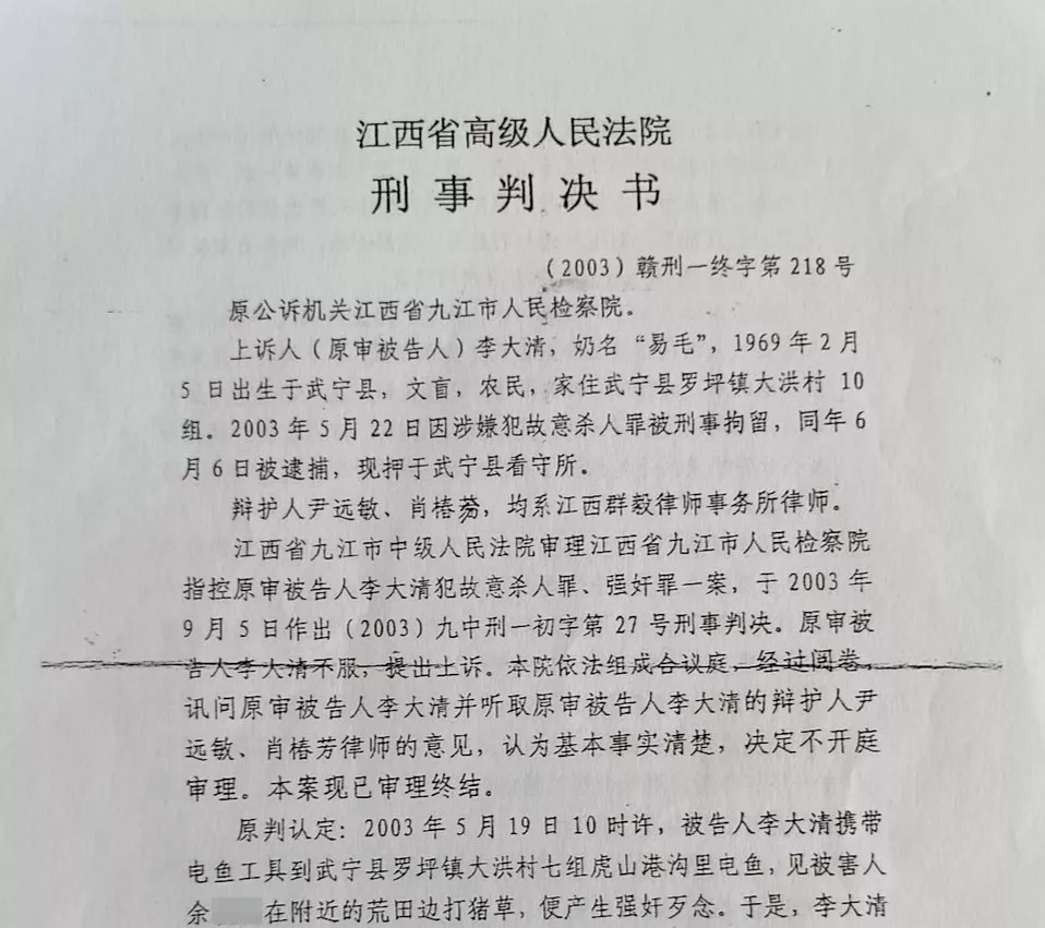 这是21年前发生在江西省九江市武宁县罗坪镇洞坪村的事。彼时,市、省两级法院认定被害人余某某被他人奸淫后杀害,同村智障者李大清被认定是该案“凶手”。