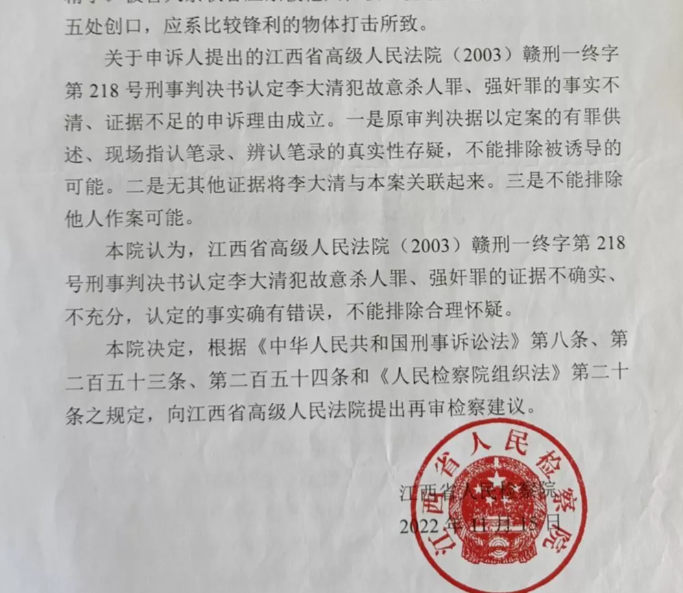 李大清出狱9个多月后,收到江西省人民检察院出具的《刑事申诉结果通知书》:江西省高级人民法院认定李大清犯故意杀人罪、强奸罪的证据不确实、不充分,认定的事实确有错误,不能排除合理怀疑。
