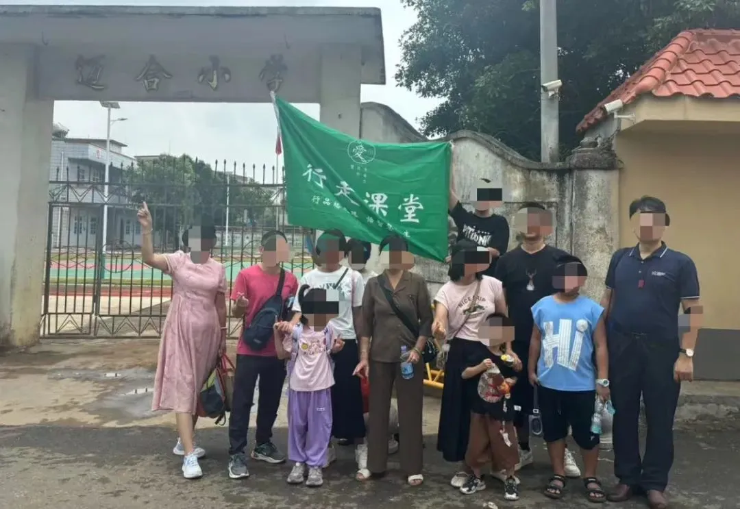 游学团在迈合小学门前打卡。图/赵雨萌摄