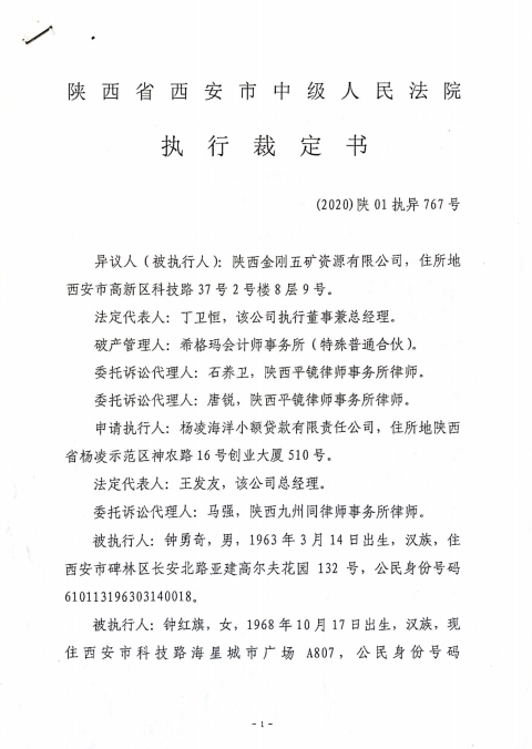 2014年12月24日,陕西杨凌海洋小额贷款有限责任公司(以下简称:小贷公司)向陕西金刚五矿资源有限公司(以下简称:金刚五矿公司)借款4390万元。双方在陕西汉唐公证处办理了(2014)陕证经字第009048号公证书。因金刚五矿公司未能按期偿还借款,经小贷公司申请,陕西汉唐公证处做出(2015)陕证执字第0016号执行证书。2015年1月,小贷公司向西安市中级人民法院(以下简称:西安中院)申请强制执行。小贷公司本以为通过司法执行可以顺利实现债权,可未曾想到维权道路艰辛且漫长,这一走就是五年之久。
