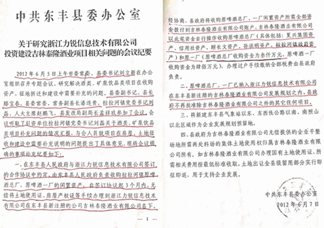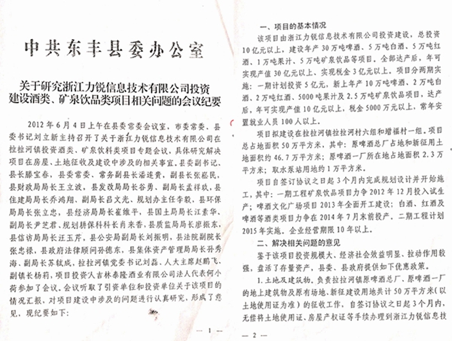 2012年6月7日,时任东丰县委书记刘立新召开会议,之后形成《关于研究浙江力锐信息技术有限公司投资建设酒类、矿泉饮品类项目相关问题的会议纪要》。
