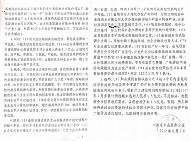 2012年4月16日,拉拉河镇政府以红头文件的方式向东丰县政府发出请示,文件名为《关于申请拨款付拉拉河镇新上30万吨啤酒系列项目所用土地及地上物费用的请示》。