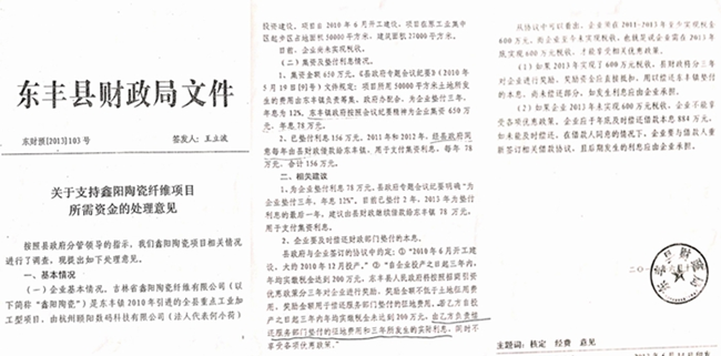 2013年6月14日,东丰县财政局文件《关于鑫阳陶瓷纤维项目所需资金的处理意见》;