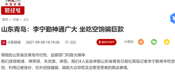 我们是程晓清、傅荷瑛、朱培美、单丽。我们4人实名举报山东省青岛日报社高级记者李宁勤常年吃空饷,利用记者身份,在外招摇撞骗,骗取大众存款及迫害受害者的真实事情。