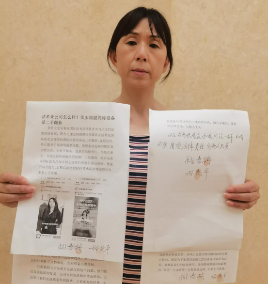 我们是北京洁希亚国际洗衣总部重庆市万州区的加盟商姚春梅、林晓平,我们今天通过网络媒体揭露北京洁希亚国际洗衣总部卖给我们的机器设备怀疑是二手翻新、虚假宣传、售后服务无保障等诸多问题。我们愿意对反映问题的真实性负责,如有不属实,愿意负法律责任,与他人无关。并通过我们的被骗经历提醒广大加盟商,北京洁希亚国际洗衣总部在网上宣传的所谓机器设备好、优惠活动力度大、后期总部全程扶持等承诺涉嫌虚假宣传,不要上当受骗。林晓平、姚春梅提供的事情经过:我们是2019年加盟的洁希亚干洗店,当初之所以决定加盟北京洁希亚国际洗衣总部,是因为北京洁希亚国际洗衣总部的业务员王超介绍说他们是全国知名品牌,总部在北京,机器耗材都是最先进的节能环保产品,还有强大的售后服务和保障等等诸多承诺。在北京洁希亚国际洗衣总部业务员王超的轮番洗脑下, 我们最终决定加盟北京洁希亚国际洗衣总部,一共投入25万多元才将这个加盟店开起来。