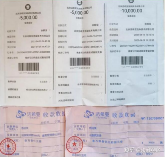 看到北京洁希亚国际洗衣优惠力度如此之大,我就有了开一个干洗店养家糊口的想法,因为当时我经营了一个小超市,不挣钱还亏钱。于是我就跟北京洁希亚国际洗衣的业务员徐显胜联系。在交谈时,徐显胜说的天花乱坠,他说8万块钱可以开一个干洗店,并且利润相当可观。于是我就心动了,把正在营业的小超市退了,通过手机支付宝给北京洁希亚国际洗衣转了两万元的订金。