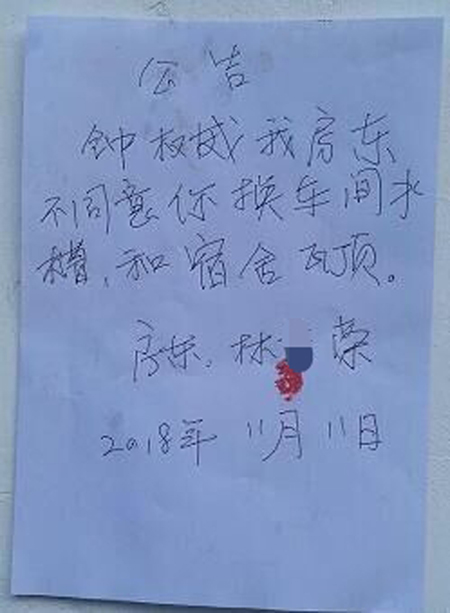 甚至在车间门口墙上和办公室门口墙上张贴“公告”:“钟权威:我房东不同意你换车间水槽和宿舍瓦顶。房东:林某荣,2018年11月11日。”并且在公告上按上手印。慑于其淫威,所有的租房客户只能忍声吞气,敢怒不敢言。