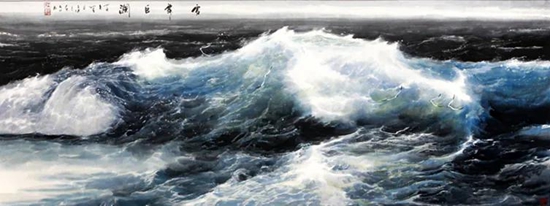 他的画面无不充满了动感和力量。他利用不同形态的线,在丰富的组合中,表现出海浪汹涌澎湃的生命图景,用弧线、斜线、曲线的交织、迭合、错位营造出整体态势不可阻挡的运动感和摧枯拉朽的巨大力量感,使画面的张力更加强烈张扬。大海雄浑壮阔、浩瀚博大的精神内涵,在整个画面的开阖聚散中得到完美体现。