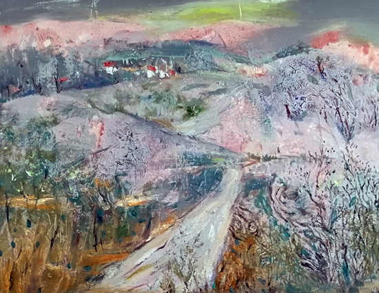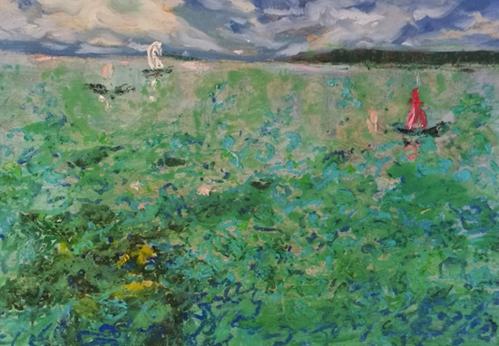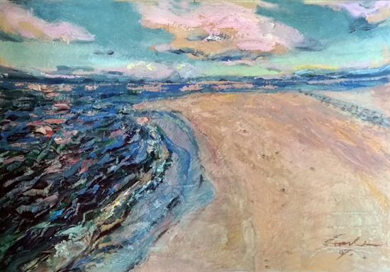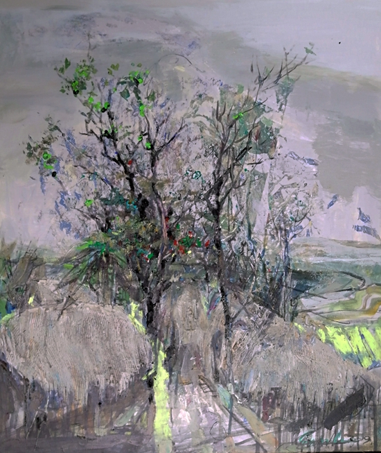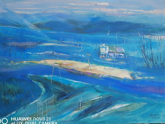 走近她的作品,就像走进一个世界,这个世界充满了阳光色彩、激情乐章,在画面的结构和色彩方面,走进自然,又不抄袭自然,既有主观处理,又有客观依据。在画面的表现形式上,不基于某种单一的形式,充分运用把控材料的特点,坦培拉、油彩、色粉笔、油画棒,丙烯等多种西方材料的综合叠加、处理、晕染、罩染、釉染等多种东方绘制手法的运用,使得画面既苍凉又温婉,既大气又神秘,即粗犷又细腻,其可看可品的内容很多。