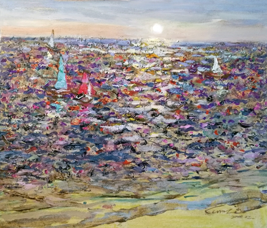 旅法十年中艺术追梦的探索,回国近20年东西方画韵的相互融合,使她的作品在艺术语言方面呈现出东西方古老、神秘、抒情、浑厚艺术画风。