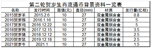 一、贺岁牛流通币的发行量,从去年发行的贺岁鼠流通币2.5亿枚的规模锐减到如今的1.5亿枚,降幅高达40%。该1.5亿枚的发行量,在第二轮贺岁生肖系列流通币中属于发行量第二少的品种。在当下第二轮贺岁生肖流通币中发行量最少的贺岁羊流通币价格已上涨至50元的情况下,新近发行的贺岁牛流通纪念币,我们还有上车的机会。