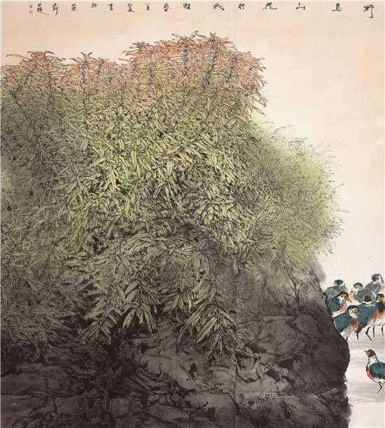 2017年8月,《野鸟山花共我闲》入选“翰墨青州·2017全国中国画作品展”