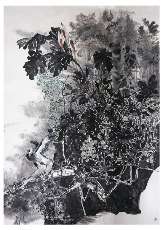 她的作品,既注重形式更讲究笔墨。每一幅构图都精心推敲,在构成上大胆出新、出奇,给人以强烈的视觉冲击;同时,她充分利用线条来表达物象,通过用笔的技巧,灵活表达物体的本质精神。不论是枝叶还是树石,不论是飞鸟还是草虫,都能做到笔简意繁,态随意变,前人所谓的“寓刚健于婀娜之中,行遒劲于婉媚之内”,正是她用笔方法的具体体现。通过轻重,深浅、虚实的线条变化,真正做到了柔中带刚,一笔三战,有皴擦,有顿挫、有勾斫,笔断意连,一气贯穿,从而在画面上使人看到的不仅仅是笔墨更是具体物象的形神传递。