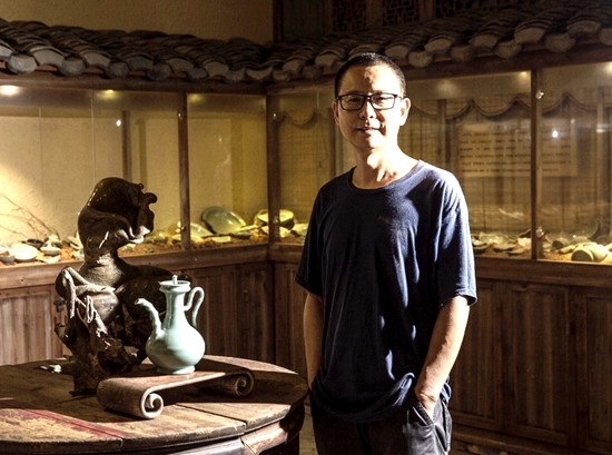 李震和自己创作的"竹节壶"在工作室中合影留念
