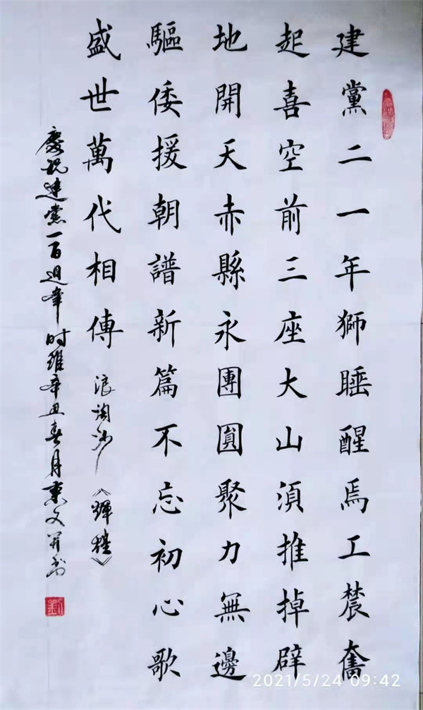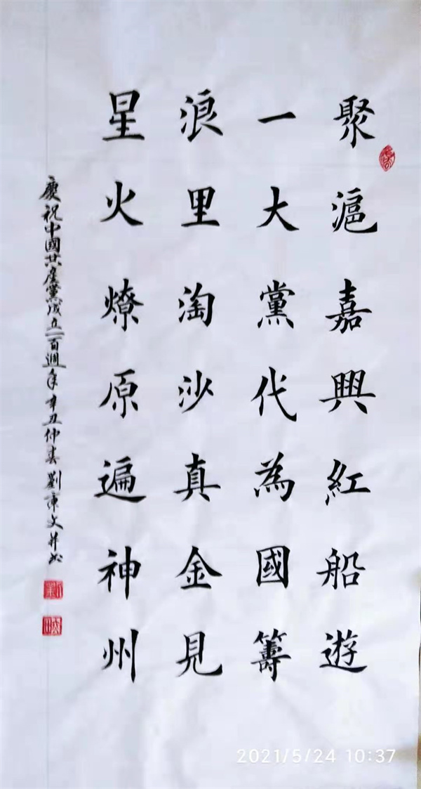 刘炳文 男 77岁 天津宝坻人。自幼酷爱书法,常年俯首砚田,寒暑不辍。书法初学颜、柳、欧,后临习二王诸家,兼收并蓄,凡与己相近者必多留意揣摩,汲取他人之长。书写亦注意线条的质感、节奏和墨色的变化。作品已形成温润流畅、藏露互用、方圆兼备、古朴典雅、洒脱飘逸的风格。