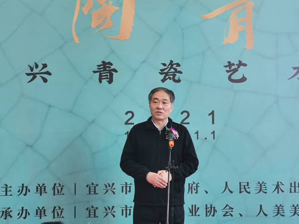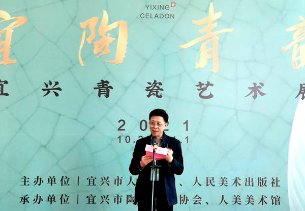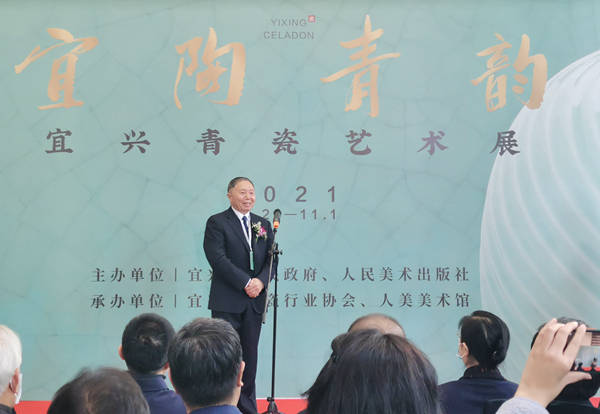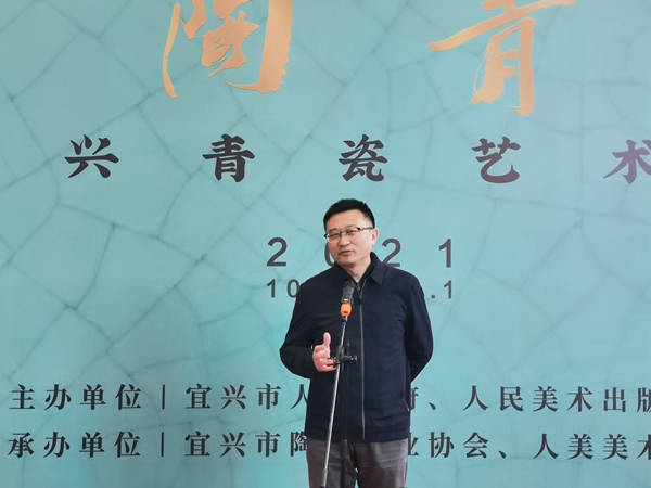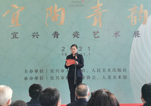 2021年10月28日14点30分,由宜兴市人民政府、人民美术出版社主办,宜兴市陶瓷行业协会、人美美术馆承办的宜陶青韵——宜兴青瓷艺术展在北京人民美术出版社人美美术馆开幕。宜兴市人民政府副市长温秀芳,中国美术出版总社党委书记、社长周伟,宜兴市人民政府办公室二级调研员路翀,宜兴市文体广电和旅游局副局长徐英姿,宜兴人人民政府外事办公室副主任杨若凌,宜兴市丁蜀镇人民政府副镇长杭海东,宜兴市陶瓷行业协会会长史俊棠,中国工艺美术大师顾绍培、季益顺,中国陶瓷艺术大师李守才,江苏省陶瓷艺术大师谈志坚以及全国陶艺界等人士出席本次活动。