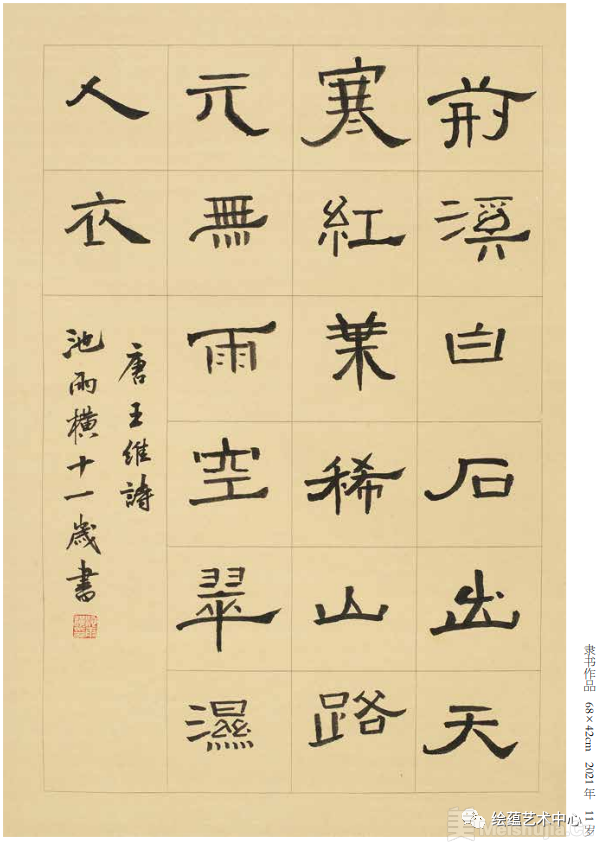 我曾在学校的艺术墙上看到了一幅学生书法作品,颇具功底,落款:池雨横。后经了解,他是小学部学生,来校几年,酷爱书画艺术。课余时间积极参加 校内“个性化发展中心”的书法班、国画班,在校外还追随几位当代书画名 家学习,其中有中国画界泰斗龙瑞老先生,中国国家画院专职画家袁学君先生、 杜浩先生,中国艺术研究院中国书法院副院长戴幼楠先生,中央美术学院附 中校长孙伟先生以及著名书画家畅世博先生等,雨横同学转益多师,受艺术 浸染,心地善良,乐于助人,师生共爱。