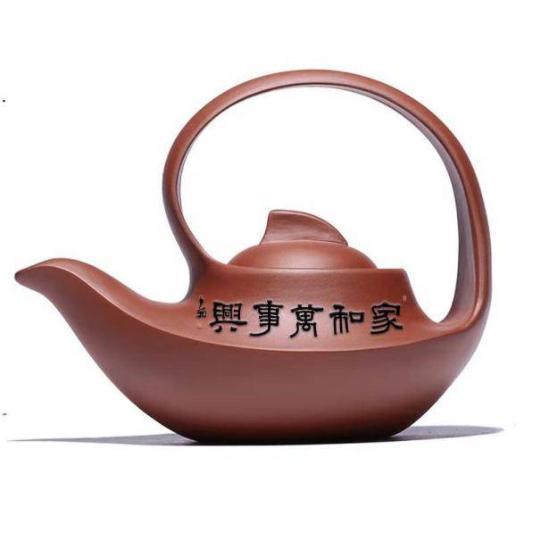 黄中先生在宜兴紫砂壶上题写:家和万事兴。