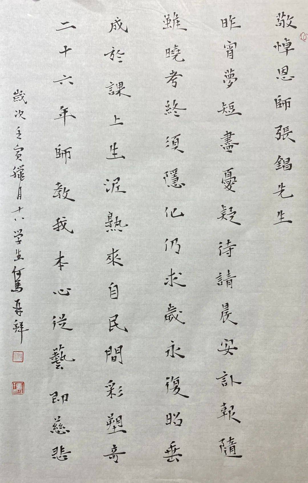 张先生9日去世后的这一段时间我都是在恍惚中度过,在我脑海里不停的闪现恩师生前的音容笑貌,我读研究生时,作为导师的他慈严宽厚、平易近人,他给我们泥塑示范时娴熟的手法,讲课时滔滔不绝的风采都历历在目;上几年许多学术评奖活动和先生常能碰面,闲聊时的谈笑风生,评奖时的仔细认真,都让人佩服不已。还想起了去年这个时候,先生和师母打车40多公里,来到我顺义工作室一块完成中国民协冬奥国礼项目,看先生在泥塑上绘彩,一笔一划,信手拈来、轻松恣意。他一头白发拿着毛笔勾勒的宽阔背影,至今还清晰的浮现在我的眼前,犹如昨天。