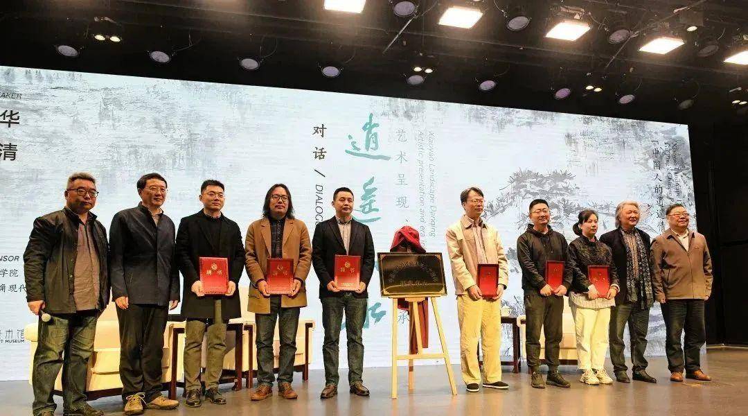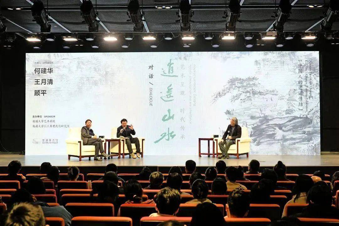 开幕式前,江苏省社会科学院党委委员、副院长、南京大学哲学系、中华文化研究院教授、博士生导师王月清,上海社会科学院原副院长、研究员、南通大学长三角现代化研究院院长、首席专家、中国浦东干部学院特聘教授上海文化研究中心首席专家何建华与顾平进行了一场艺术对话,就“逍遥山水”的艺术解读和现实意义展开了互动交流。对话活动后,还成立了南通大学现代化研究院“中国当代逍遥山水与人文精神研究中心”,何建华、顾平为中心揭牌,南通大学经管学院院长、长三角现代化研究院执行院长、首席专家姜朝晖为中心新聘任的六名研究员颁发聘书。