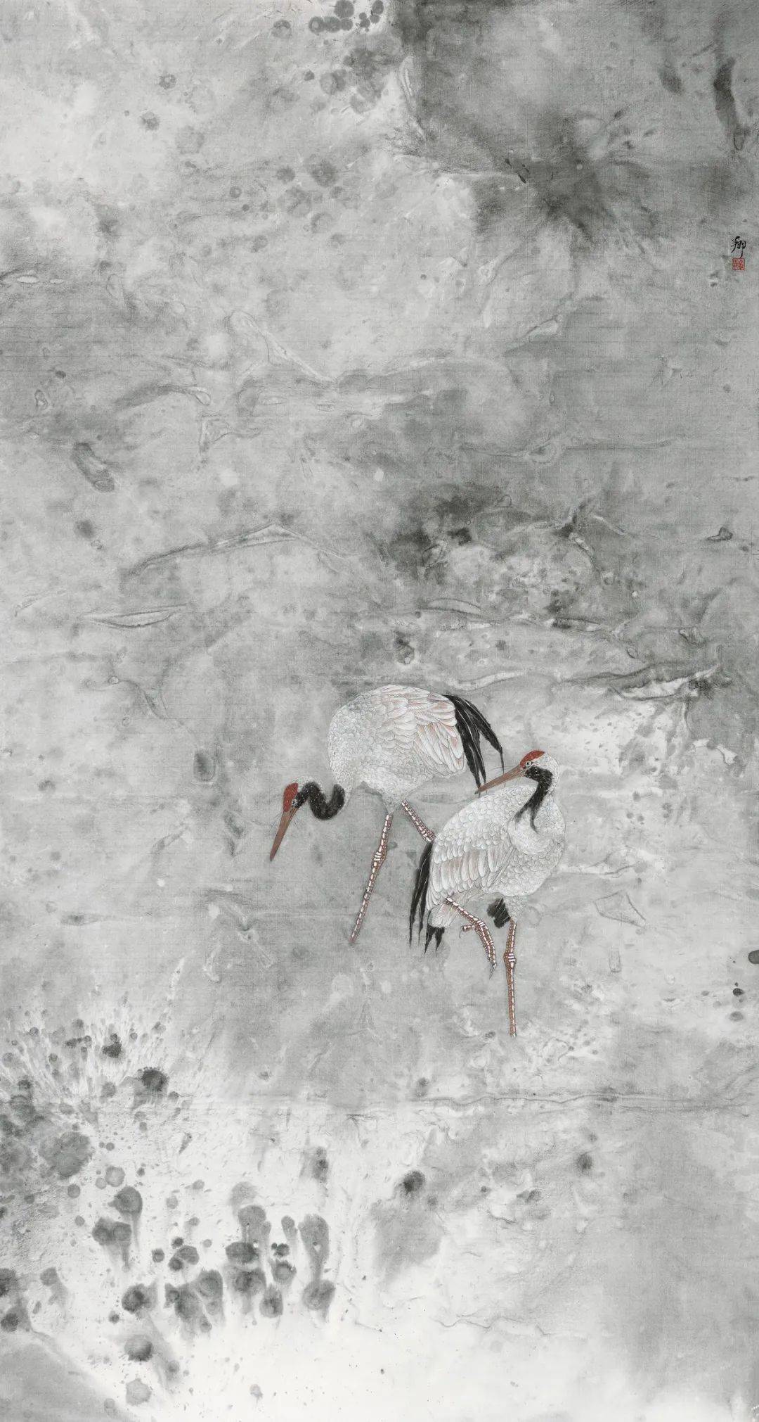 罗翔工笔画的这种“当代性”探索并不意味着他忽视传统,实际上他正是从传统花鸟画体系里走出的当代花鸟画家。在中央美术学院就读本、硕期间,他有幸师从郭怡孮、姚舜熙等先生,跟随他们数度赴西双版纳等地写生,练就了一手白描写生的功底,也像乃师一样擅长密体全景花鸟画。《冬至初寒》《空山新露晚来秋》《润物细语》和《幽林幽谷浴新影》等都代表了新世纪之初他在研习传统之中的出新,画面之中的线与色开始出现一种隔离式的变化。繁密、匀称、精微,或许是这些花鸟画具备一定现代艺术语言的特征。与这种无处不勾、无处不工的全景工笔花鸟画相比,他也探索过水墨花鸟画。这些水墨花鸟并非水墨意笔,而是大面积地在背景上,以色、墨、水相互撞色撞水而出,只有鸟仍然保留着精微勾染的特点。画面整体往往以淡墨为主,意境清幽。在这个相对传统的时期,画于2013年的两幅作品颇惹人注目,一是《北海北》,二是《万物生之瞰》。前者以富于流动感的鹭鸶充盈画面,单色水墨为基调,只有一束斜射的光照进中间那几只鹭鸶。此作并非纯粹的工笔画法,也非鹭鸶祥禽的装饰审美追求,而凸显了群禽在自然之中的生息与狂野。后者则画了并非一般意义上的花与叶,画面中扑飞的硕大的花蝶远远超出了真实的比例。显然,画家在此也试图在审美上突破一种观赏性,而对万物生态引发思考。或许,这两幅作品的实验性才让他最终完成了工笔画的“当代性”转型。
