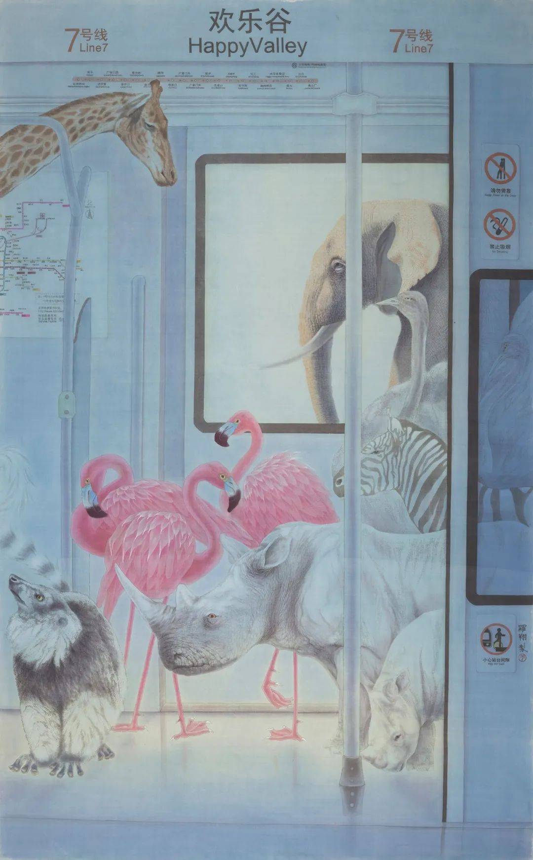罗翔所进行的工笔画探索正呈现了这种图像的观念化建构。他在“2016·中国百家金陵画展”获得大奖的《欢乐谷》,便标志着他的这种“当代性”转向。大象、斑马、犀牛、熊猫、皇冠鹤、火烈鸟、长颈鹿、环尾狐猴……这些本是在城郊豢养的动物却突然出现在我们每天乘坐的地铁上,这是种什么感受?这当然不是真实的现场。但电影中常有这样的故事和镜头,因某个动物园失控而让豢养的动物肆意行走在繁华的街道、闯入人类正常的生活秩序。不论故事真假,但人类与动物的关系在现代文明中却成为观赏与被观赏、奴役与被奴役的关系。《欢乐谷》的图像观念就在于画家不再沉迷于对花鸟自然时空关系的描写,而是出人意料地将这些欢乐谷里的动物闯入人间。它们无意之中走进了地铁,用探索的目光来观看人类及人类发明的交通工具,甚至它们隔着车窗玻璃观赏着人类和人类居住的城市。