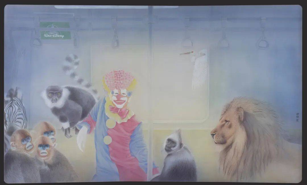 《南锣鼓巷》描写了在地铁玻璃门打开的瞬间,斑马、犀牛、长颈鹿、火烈鸟挤进门时的情景,而一群环尾狐猴早已落座,占据了座位。“南锣鼓巷”这个北京老城区的地标,在此恰恰形成了一种文本与图像的对比性,虽然画家只借用站名“南锣鼓巷”这个文本进行勾联。《晨曦迪士尼》终于在地铁里出现了穿着迪士尼小丑服饰的人的形象,威猛的狮子、顽皮的猴子、高雅的鹭鸶等都专注地观看着他幽默滑稽的形象。画面用细微的晕染表现了晨光熹微之中光色的冷暖交替,仿佛是人们清早赶到迪士尼乐园,却出乎意料地看到了另一番场景。在有关“归”的主题的三幅作品——《归途》《归程》和《归》中,画家描写了大象走出地铁玻璃门的瞬间所流露的迷途知返的一种安然,仍然在玻璃门紧闭之中找不到出口的犀牛、斑马,甚至误把入口当作出口的北极熊的那种焦虑,等等。