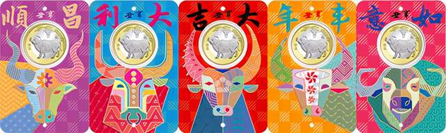 2、不同的版式装帧,是装帧币不同版本的重要构成及标志,很多时候收藏者就是冲着其特定版本、特定发行量才去购买的,而构成这种特定版本价值的,就是设计者根据普通纪念币的内容和形式,乃至普通纪念币的数量,构思品式、创意风格、搭配元素,使外包装帧所具有的造型美、结构美和装饰美与普通纪念币有机结合,达到珠联璧合、甚至是锦上添花的效应,普通纪念币也因此得到烘托和升华。看2021贺岁牛普通纪念币四款装帧产品,大吉、大利贺岁牛装帧币(两枚装)和五福之如意、丰年、大吉、大利、昌顺贺岁牛装帧币(五枚装),其考究典雅的装帧风格、独具匠心的东西文化结合,更是我国印刷工艺及装帧材料的科技水平不断提高的反映,给装帧币的艺术品位带来了质的飞跃。内衬、外裱、纸张、色彩、文字等一系列元素形成了统一和谐的视觉效果,实现了从贺岁牛普通纪念币本身到外部装帧设计在视觉上和心理上的连贯,大吉、大利贺岁牛装帧币主打两性和谐概念,五福之如意、丰年、大吉、大利、昌顺贺岁牛装帧币主打五福盈门的贺岁概念,更加立体、直观地表达出生肖牛的文化内蕴信息。而《牛运同福》卷筒装帧币版(二十枚装和一百枚装)则体现了中国传统文人的审美。四种版式的装帧币,都具有了艺术品的功能价值,在币本身的价值之外,装帧的包装与表现形式也是传达文化价值的载体,它们在设计中的构思理念,外在所使用的纸张、色彩、印刷工艺的科技感,不都是一件艺术品的组成部分吗?