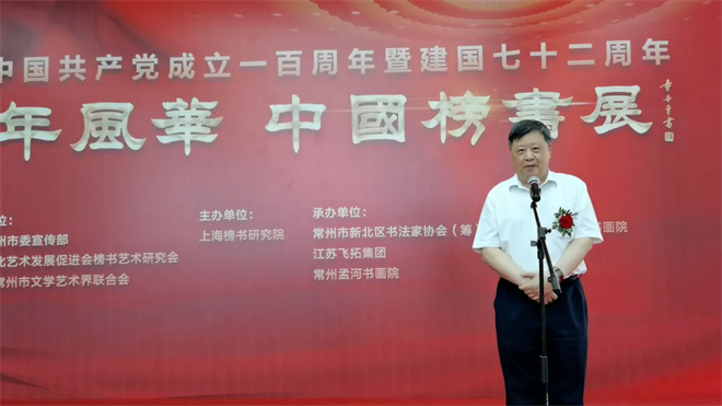 庆祝中国共产党成立100周年 喜迎建国72周年,由上海榜书研究院主办,在常州市市委宣传部、常州市文学艺术界联合会、中国文化艺术发展促进会榜书艺术研究会等部门的指导下、由常州新北区书法家协会、江苏飞拓集团、常州孟河书画院联合承办,上海广种福田书画院协办的《百年风华 中国榜书展》9月28日在常州刘海粟美术馆隆重举行。